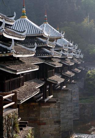 在三江侗寨精美的桥梁和木塔下