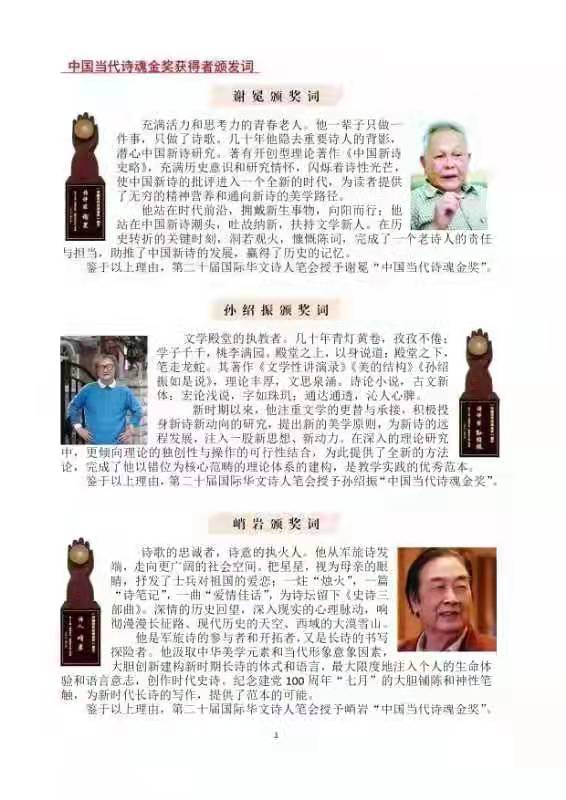 本届诗会,还为中国新时代文化发展,作出突出贡献的诗人颁发了奖杯和证书。中国当代诗魂金奖获得者:谢冕 、孙绍振 、峭岩;