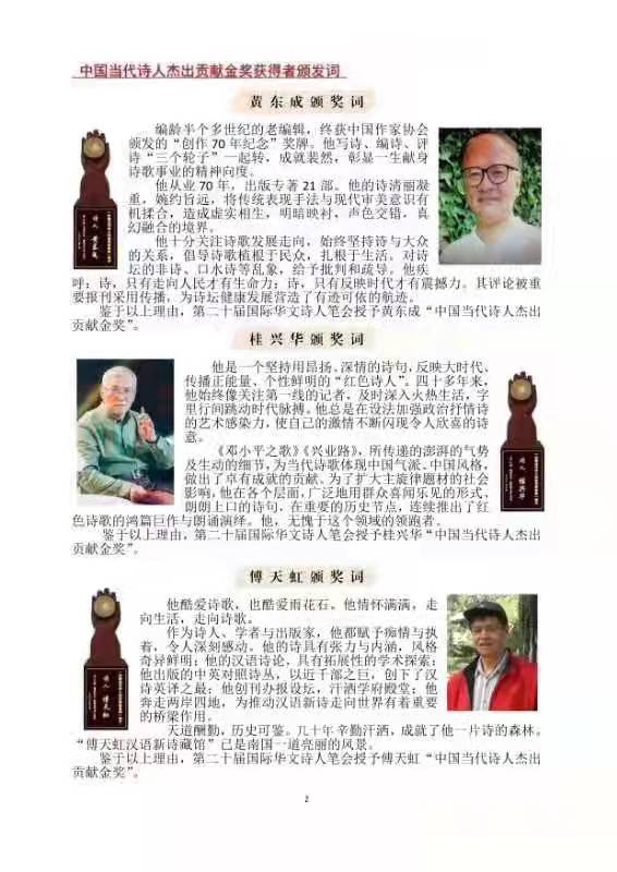 中国当代诗人杰出贡献金奖获得者:黄东成、桂兴华、傅天虹、林秉杰;