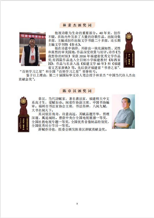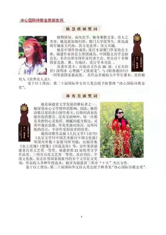 冰心国际诗歌金奖获得者:陈慧瑛、林秀美 。陈章汉获得组委会颁发的诗歌贡献金奖。获奖诗人纷纷表示,把荣誉化为动力,为中国诗歌走向世界更大的舞台,再加一把劲,做合格的人,写干净的诗。