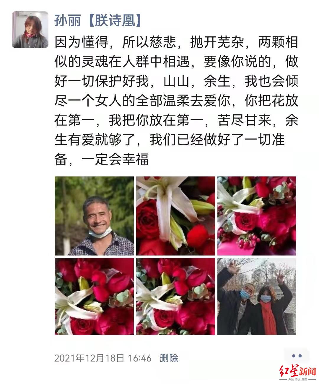 孙丽华和李松山算是老乡,家住河南省信阳市固始县,也是一位诗人。半年前,无意间在朋友圈看到别人发了条李松山的征婚启事,出于结交诗友的心,也有对李松山的好奇,孙丽华主动加了李松山微信,“加上后也没有说什么,就当一个朋友聊天。”孙丽华告诉红星新闻记者,因为她离过婚,只是想要找一个志同道合的人,所以一开始她没有想过要跟李松山谈恋爱。