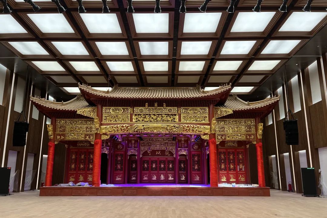 中国工艺美术馆 中国非物质文化遗产馆的多功能厅特设一座传统戏台,既能体现中国传统木结构营造技艺,又能承担非遗项目演出任务。该戏台由乐平市中乐徽派古建筑修复有限公司捐赠。