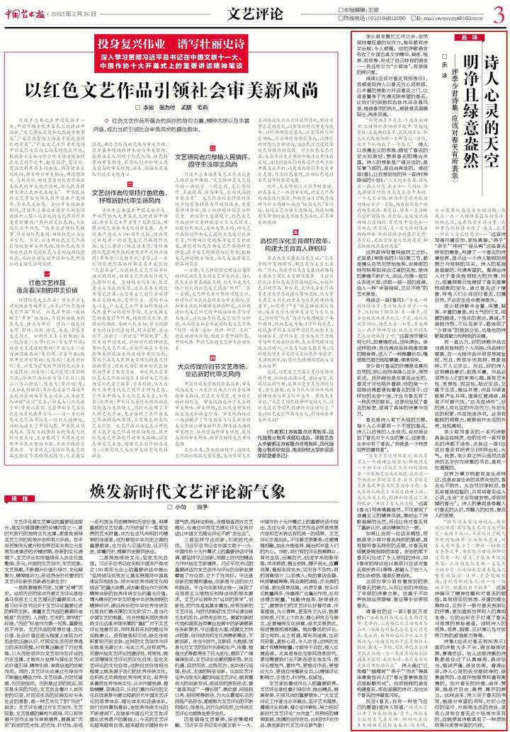 “只要享有这明媚春光/我就算不上一个精神上的穷人/即使只是一个柳下小径间茫然徘徊的落魄者//只要拥有这满庭桃花/我就是一个物质世界的富有者/虽然不过是坐在春风中低头饮茶自吟自歌//春天在诗人的笔下不仅是精神上的,/也是物质上的,精神和物质这二者的聚合,/开阔了春天的意境。”这首《春光》写得情趣盎然,不仅展现了浪漫主义的精神风貌,擦拭出了诗歌温暖的光芒,而且让我对春天有了重新认识,读后精神为之一振。