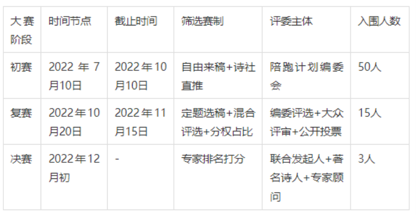 2.复赛。9月启动,通过“诗人评选+读者投票+公开投票”,从50名复赛入围者中遴选15名进入决赛。复赛阶段需要入围者提供与初赛不同的诗歌作品,并围绕主题即兴创作诗歌。具体要求届时公布。
