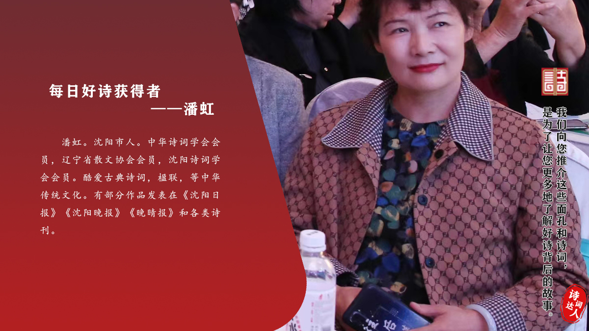 潘虹 沈阳市人。中华诗词学会会员,辽宁省散文协会会员,沈阳诗词学会会员。酷爱古典诗词,楹联,等中华传统文化。有部分作品发表在《沈阳日报》《沈阳晚报》《晚晴报》和各类诗刊。
