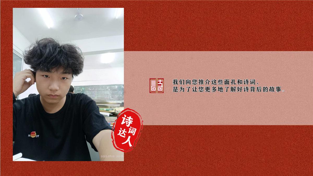 柯如沉 原名可浩然,字鸿卿,又字太璇,号怯秋居士。2005年生于湖北谷城。古体散文集:《怯秋馆散记》,文集:《坠欢未及》,词集《背灯词》,诗集《筑阳诗稿》,现代诗集《南桥梦影》。2021年2月凭作品《周黑猫——老黑》获“襄州区庆祝建党一百周年”征文大赛散文优秀奖,2021年11月凭作品《安全在我心中》获校级“安全在我心中”征文比赛二等奖,2022年五月于校级“文艺大赛”中参与演讲与朗诵比赛,后演讲自己作品《一雪前耻,霸气说不》,获得演讲一等奖与朗诵三等奖。