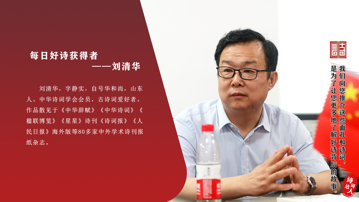 刘清华 字静实,自号华和尚,山东人。中华诗词学会会员,古诗词爱好者。作品散见于《中华辞赋》《中华诗词》《楹联博览》《星星》诗刊《诗词报》《人民日报》海外版等80多家中外学术诗刊报纸杂志。
