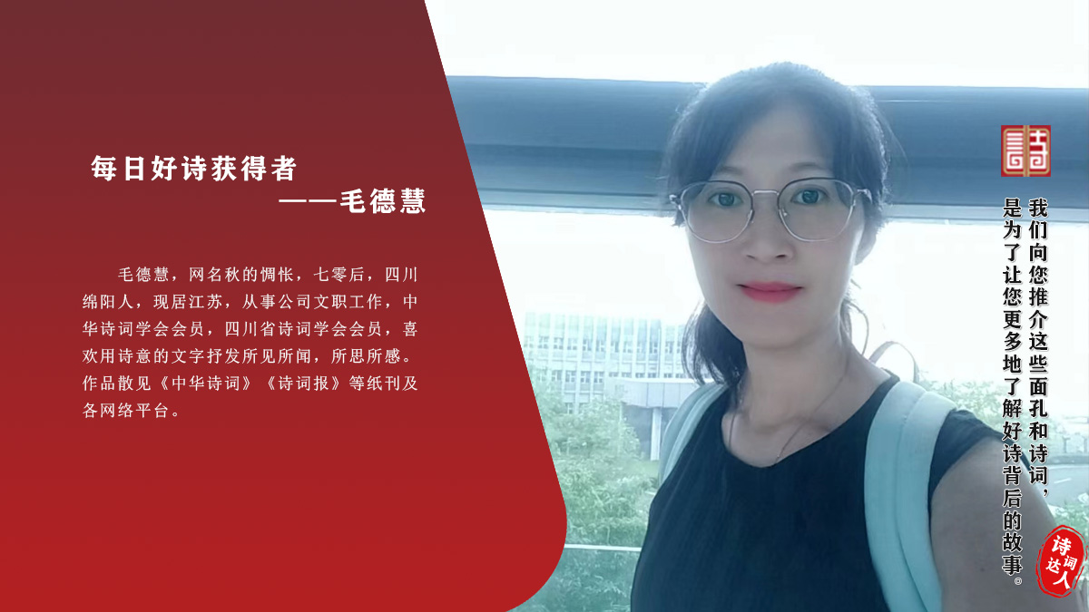 毛德慧 网名秋的惆怅,七零后,四川绵阳人,现居江苏,从事公司文职工作,中华诗词学会会员,四川省诗词学会会员,喜欢用诗意的文字抒发所见所闻,所思所感。作品散见《中华诗词》《诗词报》等纸刊及各网络平台。
