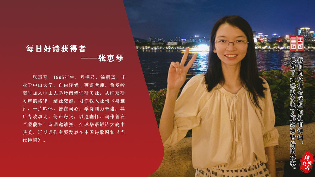 张惠琴 1995年生,号桐君、浣桐斋,毕业于中山大学,自由译者,英语老师。负笈岭南时加入中山大学岭南诗词研习社,从师友研习声韵格律,结社交游,习作收入社刊《粤雅》。一片吟怀,皆在词心,学诗则力未逮,其后专攻填词,倚声寄兴,以遣幽怀。词作曾在“蒹葭杯”诗词邀请赛、全球华语短诗大赛中获奖,近期词作主要发表在中国诗歌网和《当代诗词》。