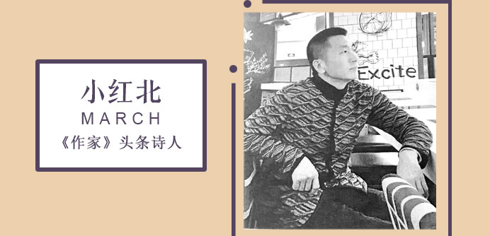 小红北,现居长春。著有诗集《静的逻辑论》《纸上的池塘》《我把月亮换成你》,散文随笔集《不安排快乐》《把世界揣兜》《睡在城市的心脏里》。作品见于《作家》《诗选刊》《中国作家》等刊物,有作品入选《中国最佳诗歌》等选本。