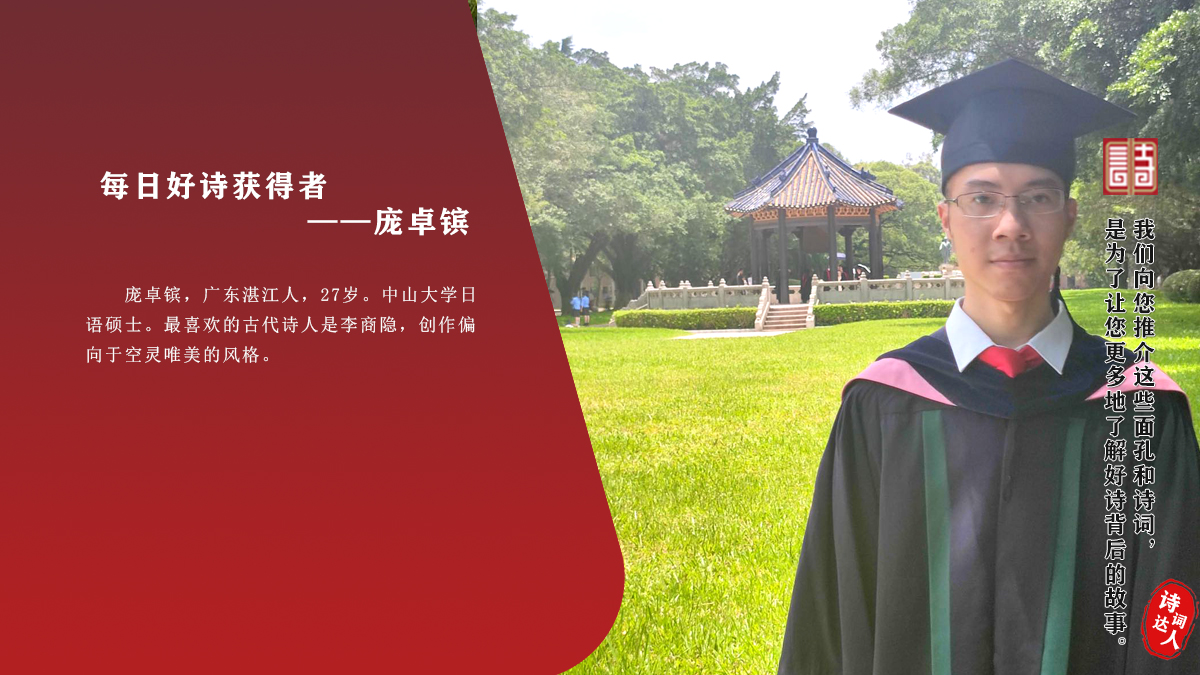 庞卓镔 广东湛江人,27岁。中山大学日语硕士。最喜欢的古代诗人是李商隐,创作偏向于空灵唯美的风格。