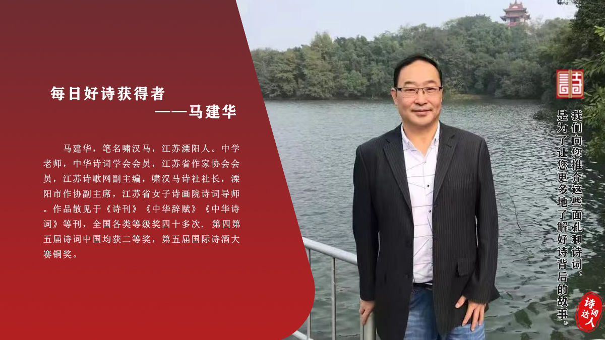 马建华 笔名啸汉马,江苏溧阳人。中学老师,中华诗词学会会员,江苏省作家协会会员,江苏诗歌网副主编,啸汉马诗社社长,溧阳市作协副主席,江苏省女子诗画院诗词导师。作品散见于《诗刊》《中华辞赋》《中华诗词》等刊,全国各类等级奖四十多次. 第四第五届诗词中国均获二等奖,第五届国际诗酒大赛铜奖。