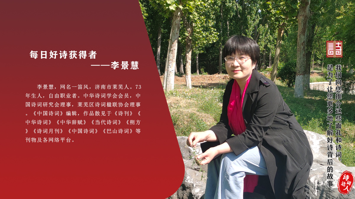 李景慧 网名一笛风,济南市莱芜人。73年生人,自由职业者。中华诗词学会会员,中国诗词研究会理事,莱芜区诗词楹联协会理事。《中国诗词》编辑,作品散见于《诗刊》《中华诗词》《中华辞赋》《当代诗词》《朔方》《诗词月刊》《中国诗词》《巴山诗词》等刊物及各网络平台。