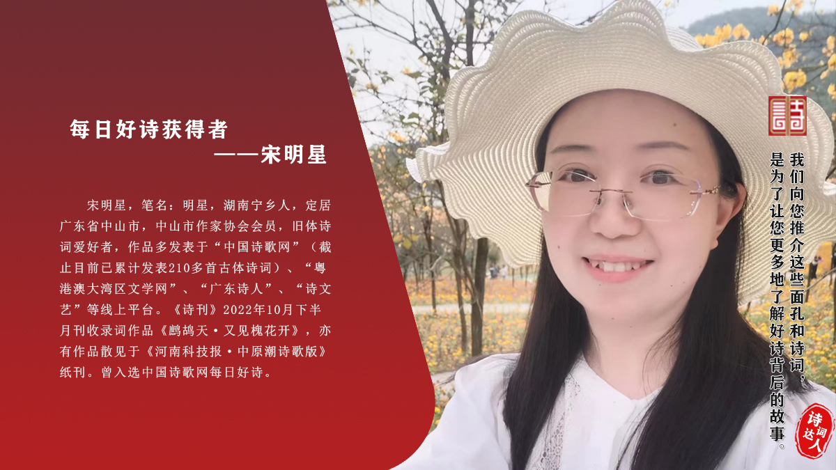 宋明星 笔名:明星,湖南宁乡人,定居广东省中山市,中山市作家协会会员,旧体诗词爱好者,作品多发表于“中国诗歌网”(截止目前已累计发表210多首古体诗词)、“粤港澳大湾区文学网”、“广东诗人”、“诗文艺”等线上平台。《诗刊》2022年10月下半月刊收录词作品《鹧鸪天·又见槐花开》,亦有作品散见于《河南科技报·中原潮诗歌版》纸刊。曾入选中国诗歌网每日好诗。