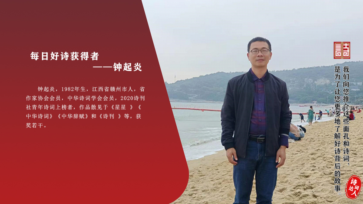钟起炎 1982年生,江西省赣州市人,省作家协会会员,中华诗词学会会员,2020诗刊社青年诗词上榜者,作品散见于《星星 》《中华诗词》《中华辞赋》和《诗刊 》等,获奖若干。
