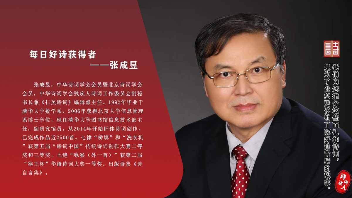 张成昱 中华诗词学会会员暨北京诗词学会会员,中华诗词学会残疾人诗词工作委员会副秘书长兼《仁美诗词》编辑部主任。1992年毕业于清华大学数学系,2006年获得北京大学信息管理系博士学位,现任清华大学图书馆信息技术部主任,副研究馆员。从2014年开始旧体诗词创作,已完成作品近2500首。七律“桥牌”和“洗衣机”获第五届“诗词中国”传统诗词创作大赛二等奖和三等奖,七绝“咏猴(外一首)”获第二届“猴王杯”华语诗词大奖一等奖。出版诗集《诗自言集》。