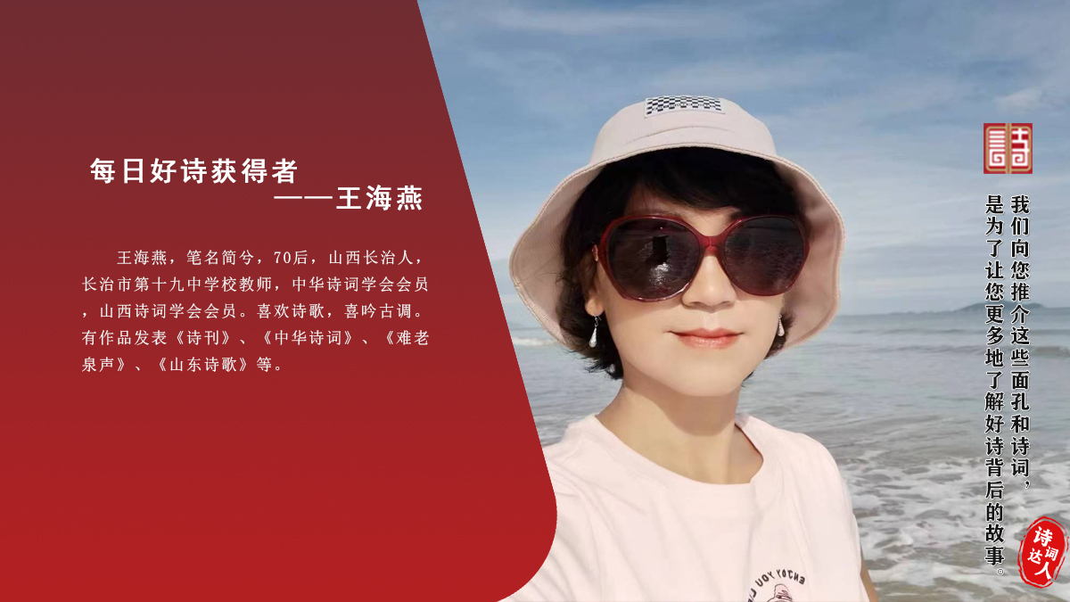 王海燕 笔名简兮,70后,山西长治人,长治市第十九中学校教师,中华诗词学会会员,山西诗词学会会员。喜欢诗歌,喜吟古调。有作品发表《诗刊》、《中华诗词》、《难老泉声》、《山东诗歌》等。