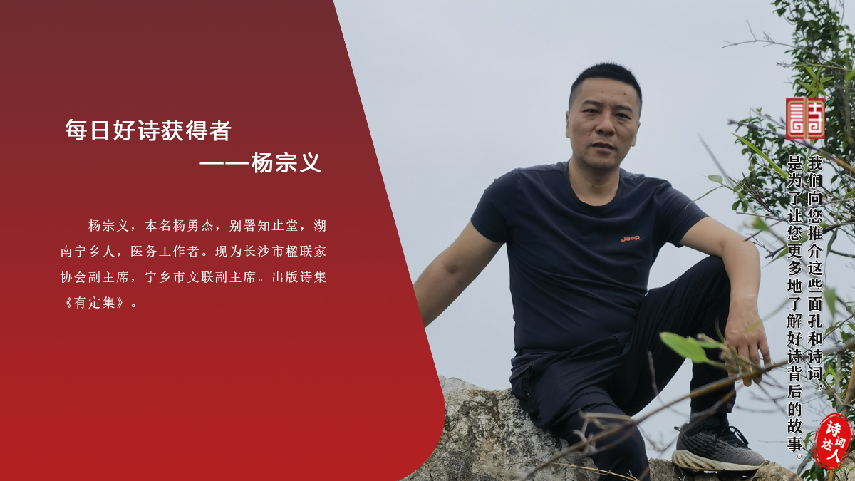 杨宗义,本名杨勇杰,别署知止堂,湖南宁乡人,医务工作者。现为长沙市楹联家协会副主席,宁乡市文联副主席。出版诗集《有定集》。
