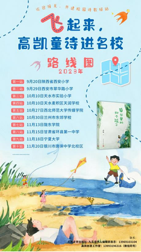 “飞起来,高凯童诗进名校”第一季阅读公益分享活动圆满结束,在大中小学校园产生了强烈的反响。这项活动由人民文学出版社、九久童书、仁风国学馆、西北师范大学传媒学院、宁夏大学图书馆、宁夏文艺家协会单位全程或分段主办的活动,历时三个月,跨越陕甘宁三省一区,于20日在银川圆满收官。这项“童诗陕甘宁”路线图如下: