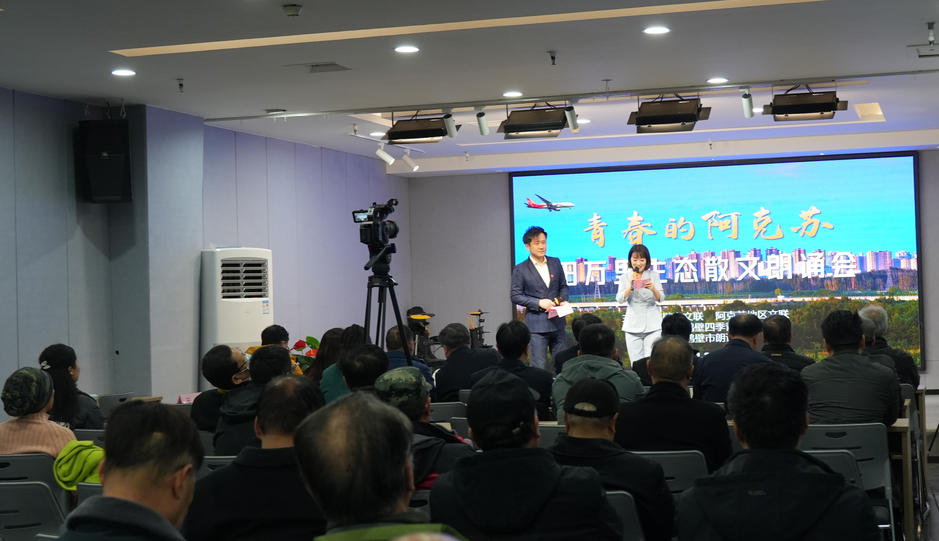 朗诵会上,朗诵者深情细腻的朗诵,展现了作者田万里敏锐的视角、非凡的想象、娴熟的手法、真情的流露,让大家感受到阿克苏的生态气息,感受到了常人难以形容和难以捕捉的自然之美、生态之美、和谐之美。