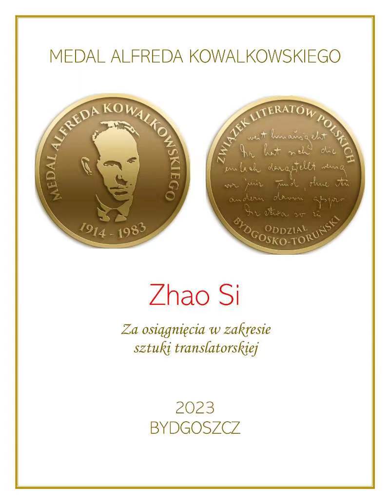 我们非常高兴地宣布,经由评委会决定,您被授予了2023年度阿尔弗雷德·科瓦尔可夫斯基奖章(Alfred Kowalkowski Medal)。科瓦尔可夫斯基是当代波兰最重要的文学译者之一,在他大量的译自拉丁语、德语、法语的著作中,尤以对卡夫卡的翻译为人广泛称道,以他命名的奖章是波兰作家协会波美拉尼亚-库亚维地区最重要的译者奖掖奖项。我们对您的褒奖尤为强调:作为一位具有世界性视野,广受赞誉,译作丰富的诗歌译者,您对西、南斯拉夫诗人如捷克诗人弗拉基米尔·霍朗、斯洛文尼亚诗人托马斯·萨拉蒙及对波兰、斯洛伐克等地诗人卓越的、技巧高超的翻译使得他们在中国广为人知,产生了重要影响。您是我们时代中“诗人译诗”的典范。祝贺您。