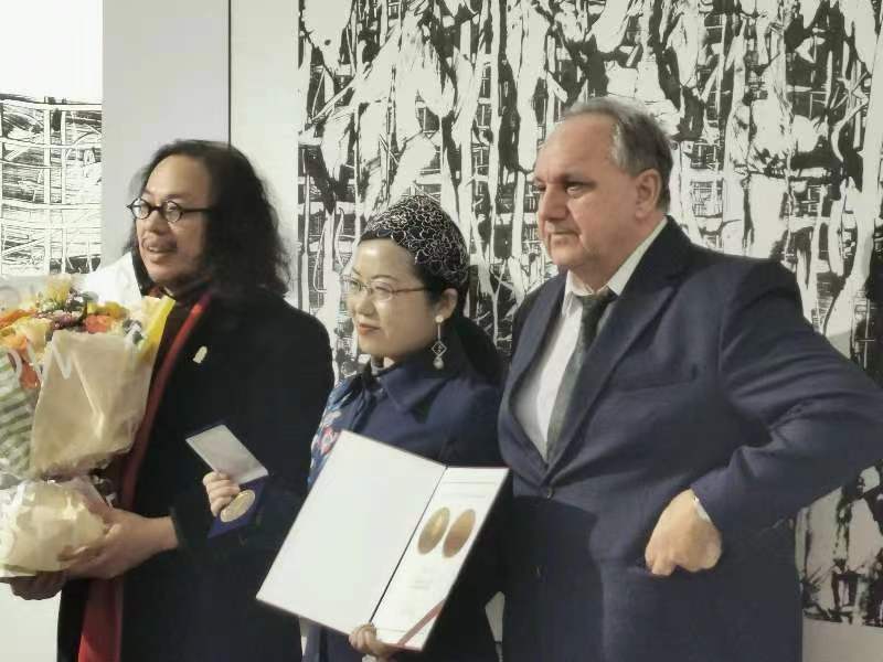 随后,12月7日下午的北京,798太和艺术空间二楼的展厅里,中国哲学家、艺术批评家、策展人夏可君迎来了他的高光时刻。荷马奖章主席波兰诗人、作家大流士·莱比奥达教授和赵四共同为夏可君举行了奖章颁授。授奖词高度肯定了夏可君在三个方面的文化贡献: