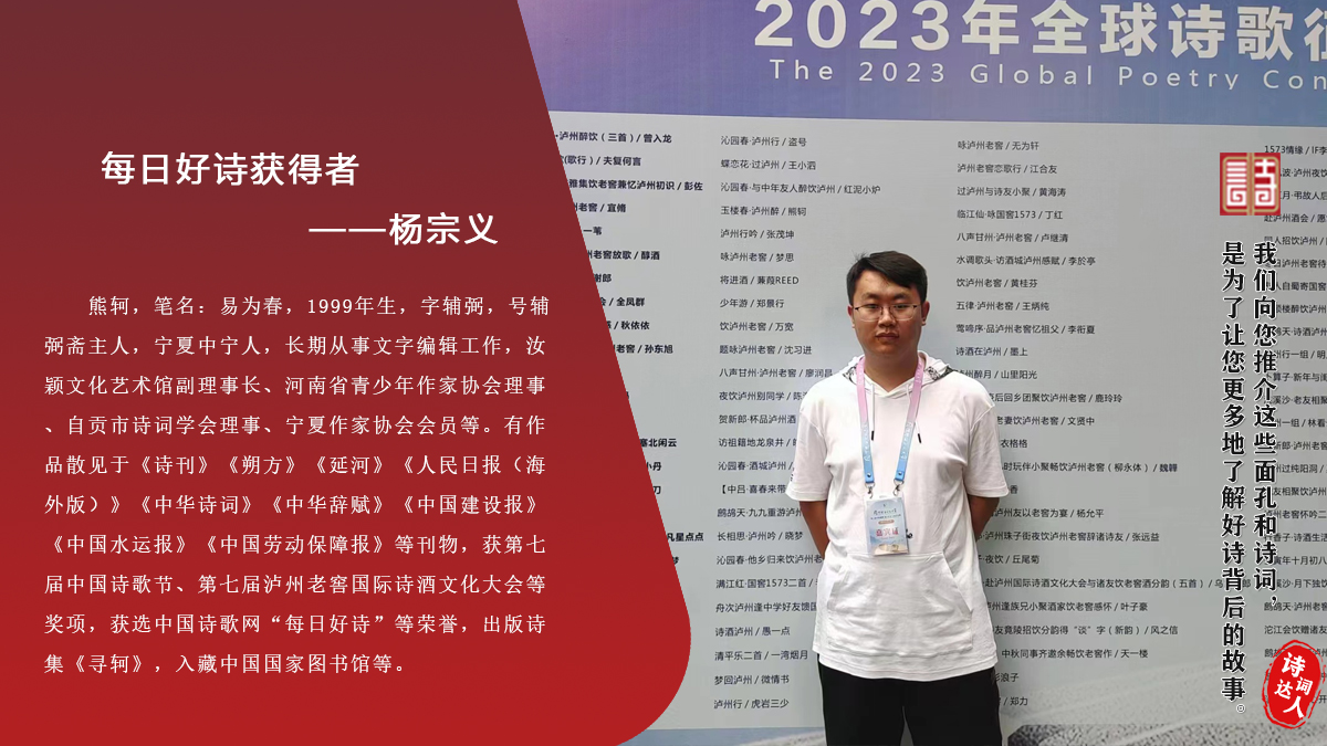 熊轲 笔名:易为春,1999年生,字辅弼,号辅弼斋主人,宁夏中宁人,长期从事文字编辑工作,汝颖文化艺术馆副理事长、河南省青少年作家协会理事、自贡市诗词学会理事、宁夏作家协会会员等。有作品散见于《诗刊》《朔方》《延河》《人民日报(海外版)》《中华诗词》《中华辞赋》《中国建设报》《中国水运报》《中国劳动保障报》等刊物,获第七届中国诗歌节、第七届泸州老窖国际诗酒文化大会等奖项,获选中国诗歌网“每日好诗”等荣誉,出版诗集《寻轲》,入藏中国国家图书馆等。