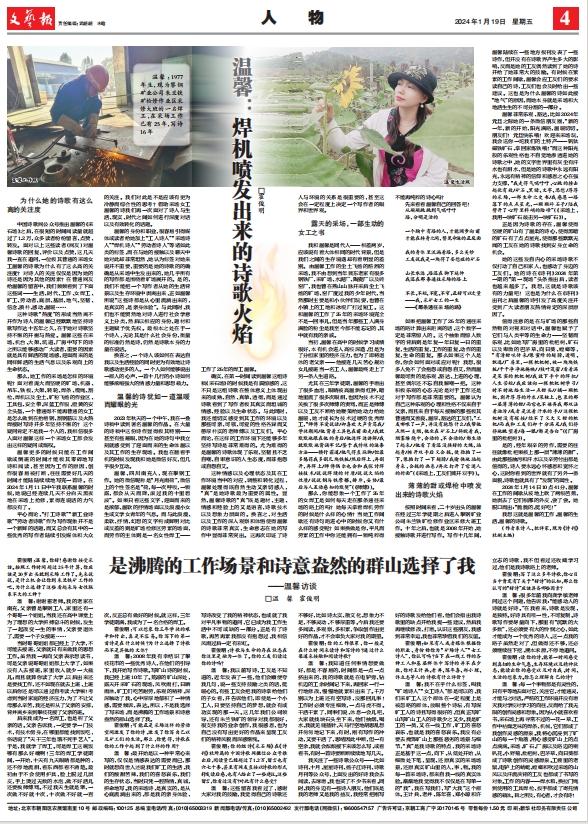 温馨:我不在乎什么标签,叫我“矿场诗人”“女工诗人”都是可以的,我们采矿工人这个群体在一定程度上是被忽略的群体,放眼整个诗坛,有写煤矿工人的诗且写得很好的,但真正写矿山写矿山工人的诗歌少之又少。我是矿工的一员,又在一线工作,矿工的喜怒哀乐,也就是我的喜怒哀乐。我没有必要去掩饰矿山上那些恶劣的场景与细节,“真”是我诗歌的特点,我的采场诗正是基于这一点,向下,从低处开始,从细微处下笔,呈现、还原真实的采场场景,还原真实矿山里的人、事、物。我的每一首采场诗,都来自我一线的真实体验。渐渐地我觉得我不仅仅是在写单一的“我”,我在写我们,写“大我”这个群体。王计兵、老井、陈年喜、郑小琼和许立志的诗歌,我不但看过还收藏学习过,他们是我诗歌路上的老师。