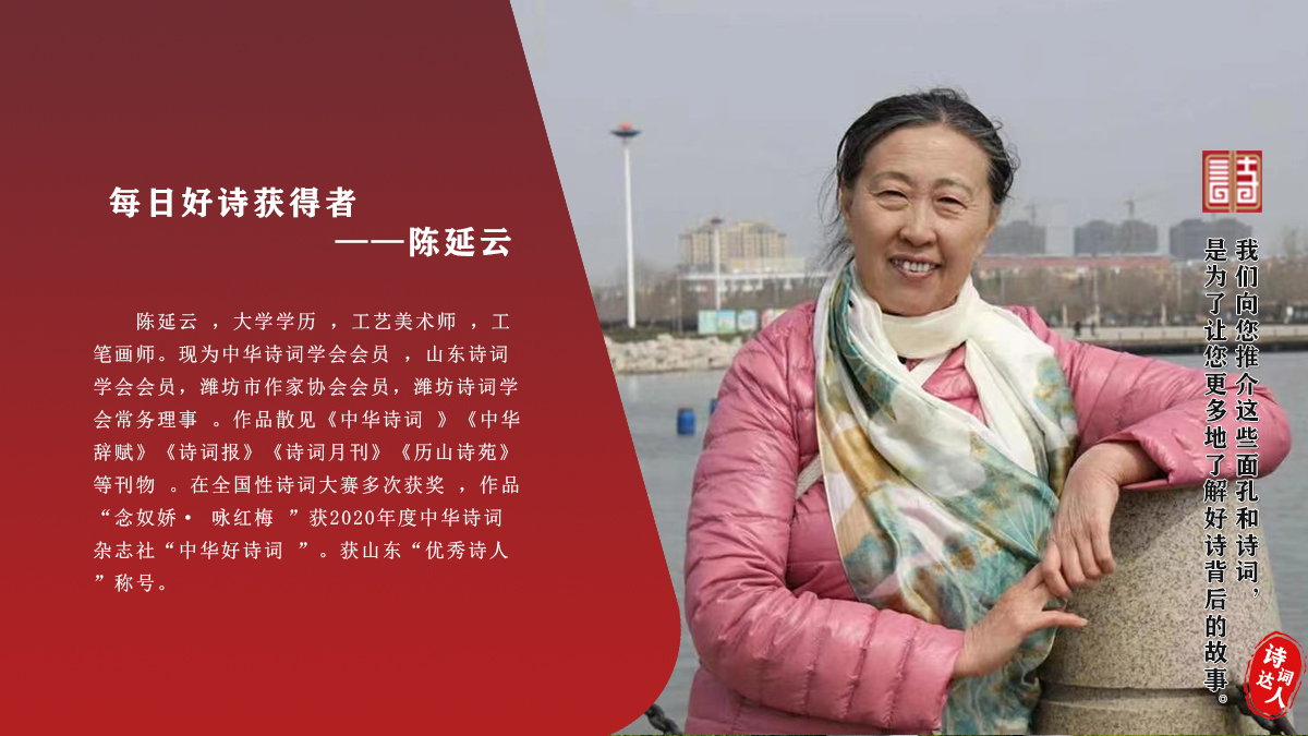 陈延云 大学学历 ,工艺美术师 ,工笔画师。现为中华诗词学会会员 ,山东诗词学会会员,潍坊市作家协会会员,潍坊诗词学会常务理事 。作品散见《中华诗词 》《中华辞赋》《诗词报》《诗词月刊》《历山诗苑》等刊物 。在全国性诗词大赛多次获奖 ,作品 “念奴娇· 咏红梅 ”获2020年度中华诗词杂志社“中华好诗词 ”。获山东“优秀诗人”称号。