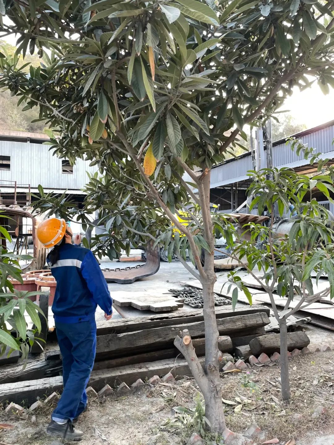 没什么波澜的生活里,工人们靠种点什么来打发时间。有人种芒果树,有人种了四棵花椒树。一排稀稀拉拉的小树里,那株挨着厂房的枇杷树不算引人注意,树高将近两米,枝叶算不上繁茂,周围时常随意堆放生了锈的铁板,和暂时找不到用途的木材。