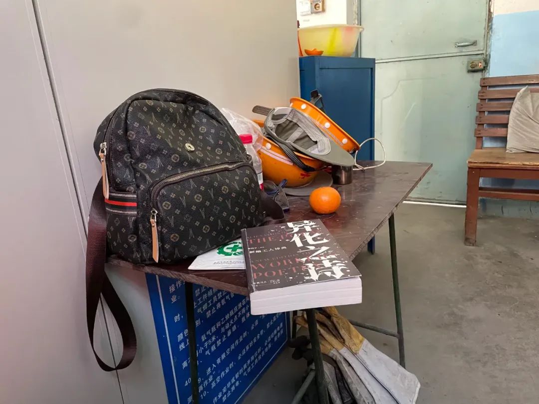 中午的休息时间,她在休息室琢磨刚记录下的灵感。休息室很简陋,两排储物柜,两张长椅,唯一的一张小木桌横放着,堆满了安全帽、水杯、手套,其他人在刷手机、打瞌睡,温馨弓着背在这张桌上读诗、写诗,窗外还是连绵的山坡,时不时传来采矿运输车驶过的轰隆声。
