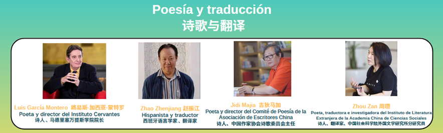 4月17日,北京塞万提斯学院举办了一场关于诗歌与翻译的分享会,以此庆祝诗人、塞万提斯学院院长路易斯·加西亚·蒙特罗荣获2021年度金藏羚羊国际诗歌奖。特邀诗人、塞万提斯学院现任院长路易斯·加西亚·蒙特罗、西班牙语学者、翻译家赵振江、诗人、中国作家协会诗歌委员会主任吉狄马加以及诗人、翻译家、中国社会科学院文学研究所研究员周瓒作为嘉宾。北京塞万提斯学院院长伊莎贝尔为活动致开幕词。