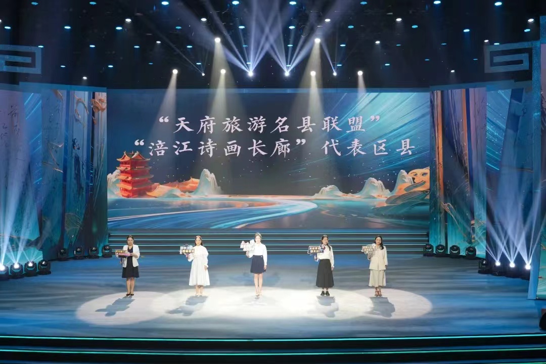▲天府旅游名县联盟代表单位和涪江诗画长廊单位上台并宣介口号。