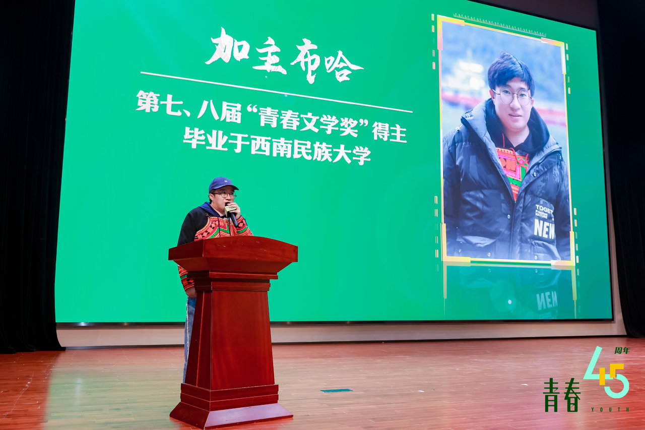 活动现场,第七、第八届“青春文学奖”小说、诗歌双料首奖得主,来自四川大凉山的彝族青年加主布哈发表演讲。他说,“青春文学奖”给了他莫大的文学鼓励,让他有了更坚定的勇气。“我没有剪断身上彝族语言的脐带,反而随着文学创作的深入,对那片土地有了更深的思考。彝族村落的生活经历滋养了我的创作。”第六届“青春文学奖”中短篇小说奖得主、南京市“青春文学人才计划”签约作家焦典则作为颁奖嘉宾,被请到现场。她说,在车站,当她看到接站人员手中“《青春》杂志社”接站牌,便有种回到家的感觉。她把获奖作品《木兰舟》作为自己首部小说集的第一篇,就是因为“青春文学奖”是她文学之路起步阶段尤为重要的一笔。