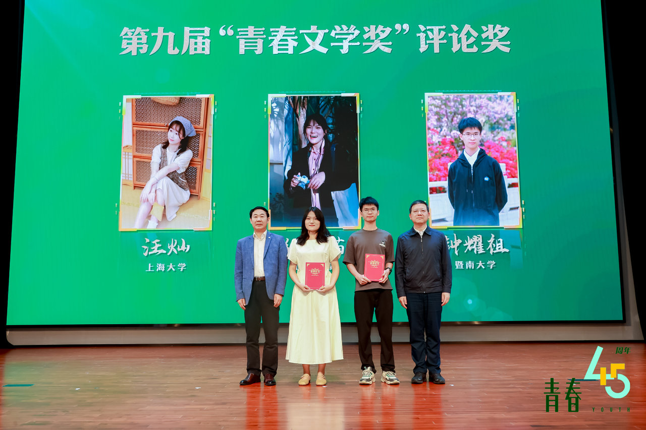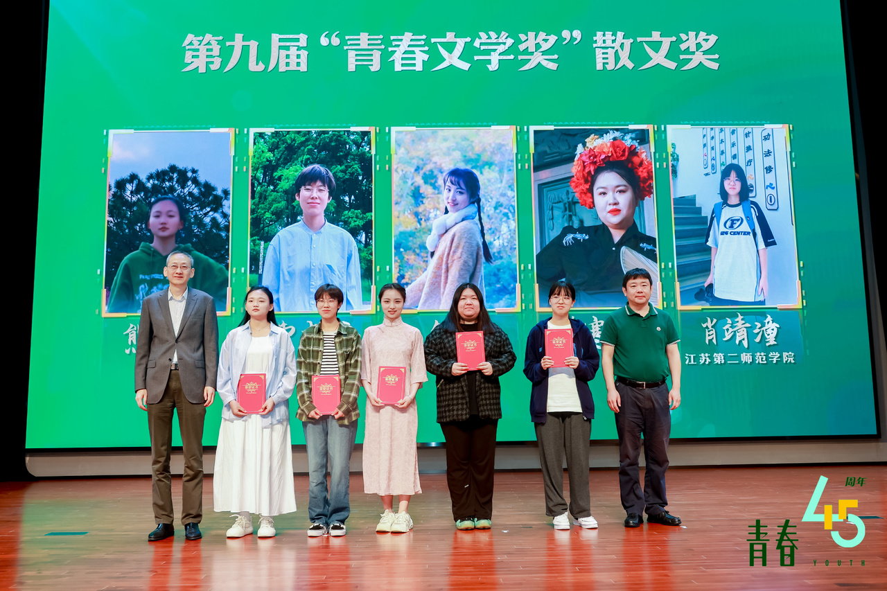 5月11日,“正青春 向未来”第九届青春文学奖颁奖典礼在南京江北图书馆举行。第九届“青春文学奖”设小说奖、诗歌奖暨年度十大校园诗人奖、散文奖、评论奖四大奖项,共有23名高校学生获奖。其中,殷文佳的《骑出槐阳路》、吉克有古的《星星河或冬日》(组诗)、解言的《水生》、纪水苗的《抒情·废墟·怀旧——理解孙频近作的三个关键词》分获各奖项的首奖。著名作家王蒙获青春文学奖·特别奖。