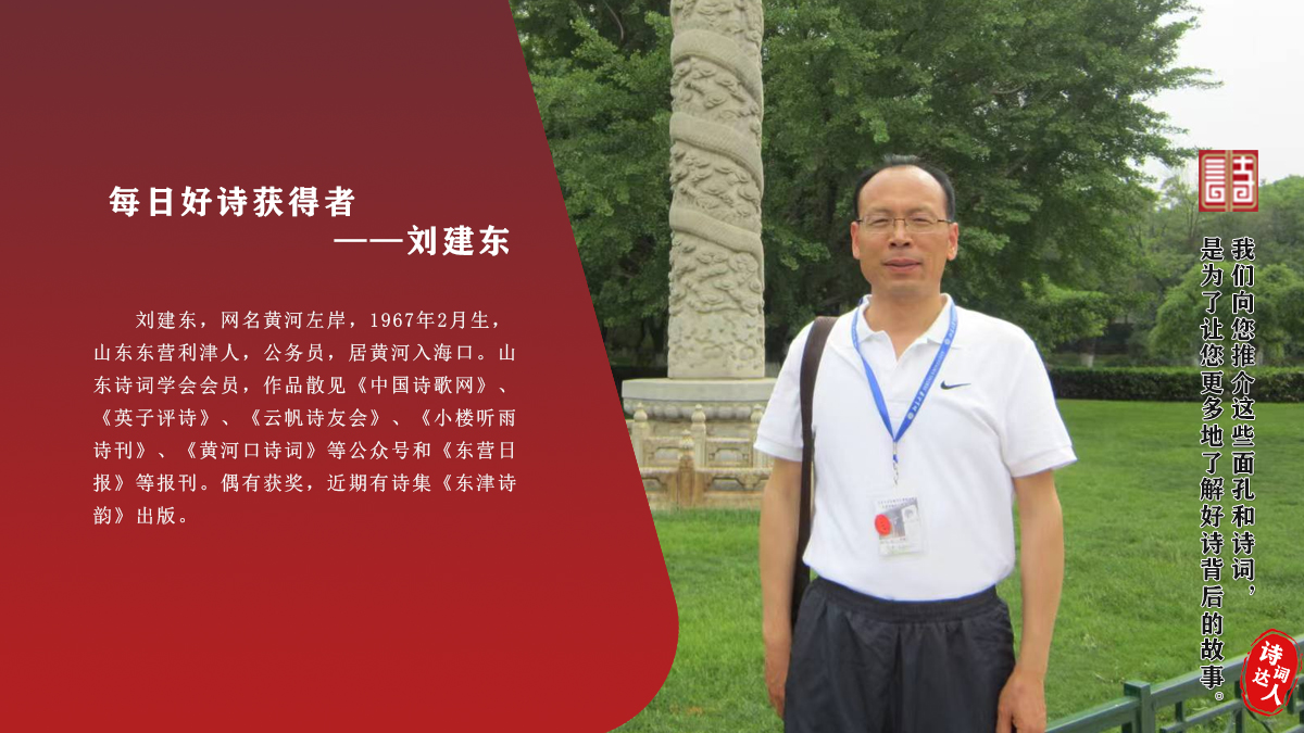 刘建东 网名黄河左岸,1967年2月生,山东东营利津人,公务员,居黄河入海口。山东诗词学会会员,作品散见《中国诗歌网》、《英子评诗》、《云帆诗友会》、《小楼听雨诗刊》、《黄河口诗词》等公众号和《东营日报》等报刊。偶有获奖,近期有诗集《东津诗韵》出版。