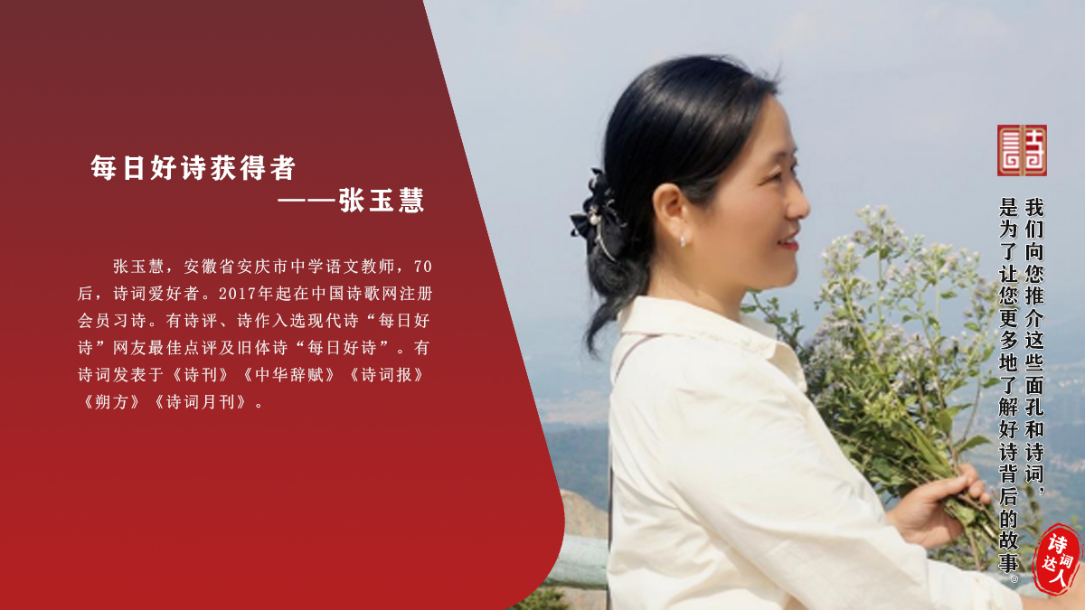 张玉慧 安徽省安庆市中学语文教师,70后,诗词爱好者。2017年起在中国诗歌网注册会员习诗。有诗评、诗作入选现代诗“每日好诗”网友最佳点评及旧体诗“每日好诗”。有诗词发表于《诗刊》《中华辞赋》《诗词报》《朔方》《诗词月刊》。