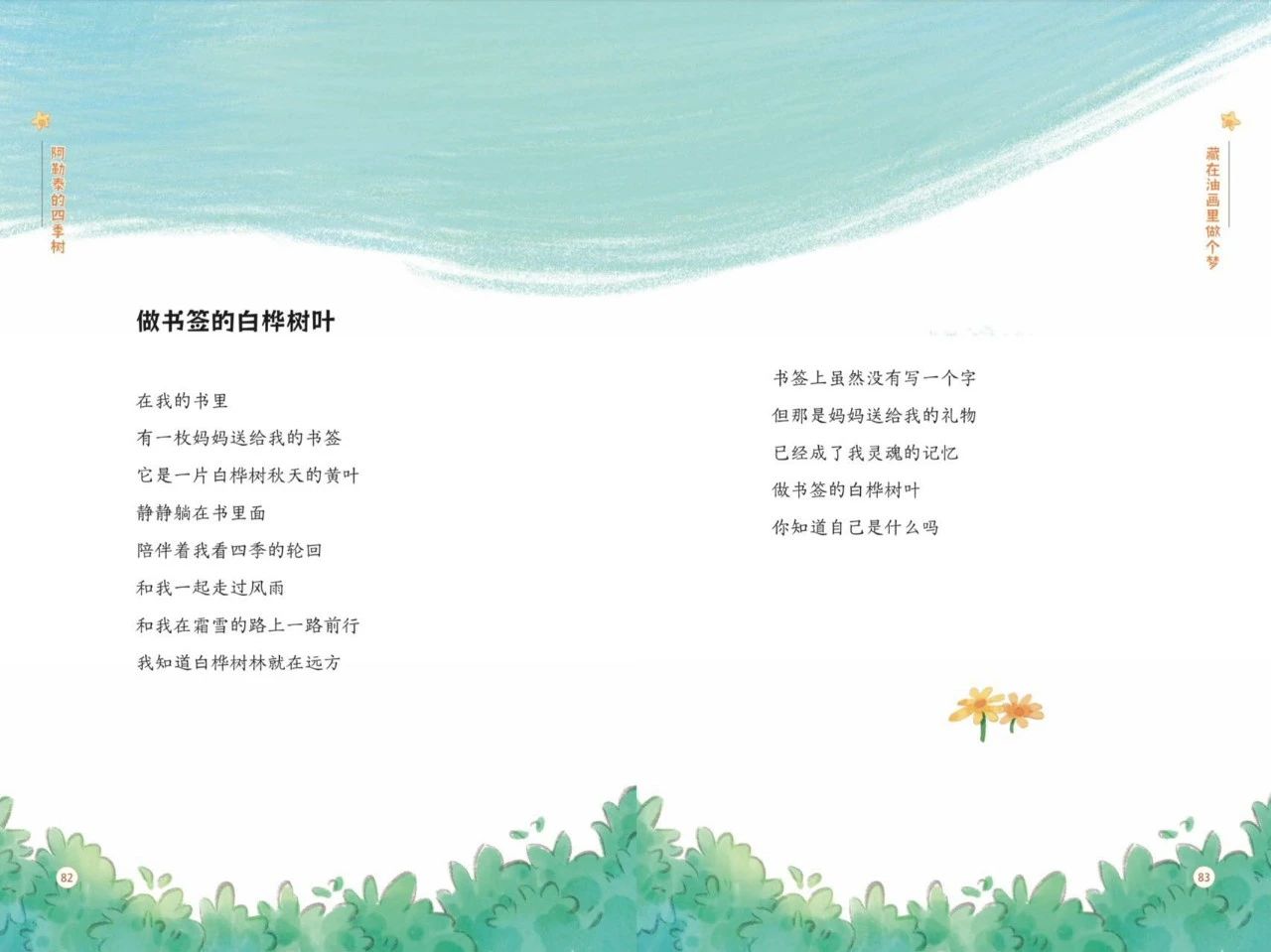 一片白桦树秋天的黄叶做的书签,陪伴诗人看四季轮回,走过雨雪风霜,意味着妈妈并不在身边,也告诉我们,妈妈不可能陪伴孩子的一生。黄叶,书签,或许是童年时妈妈留下的信物,睹物思人,已经恍若隔世。这首诗即便对一个成年的读者来说,也有一种感人至深的情感力量:和妈妈在一起的时光是多么弥足珍贵,童年的无忧无虑又是多么容易转瞬即逝。