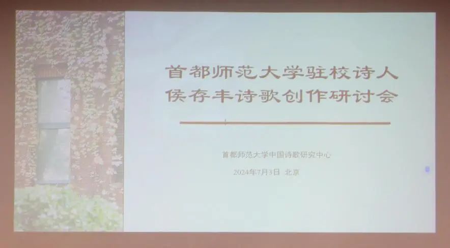 2024年7月3日,由首都师范大学中国诗歌研究中心(以下简称诗歌中心)主办的“首都师范大学驻校诗人侯存丰诗歌创作研讨会”在京举行。来自首都师范大学、中央财经大学、中央民族大学、北京体育大学、对外经济贸易大学、中国传媒大学、海南大学、南开大学、天津社会科学院、内蒙古师范大学、国家检察官学院、首都师范大学附属定慧里小学,诗刊社、中华读书报、中国艺术报、方圆杂志社、中国诗歌春晚等国内高校、科研机构与报刊杂志、社会机构的学者、评论家、编辑、诗人、导演,以及来自国内高校的部分硕博研究生参加了本次会议。