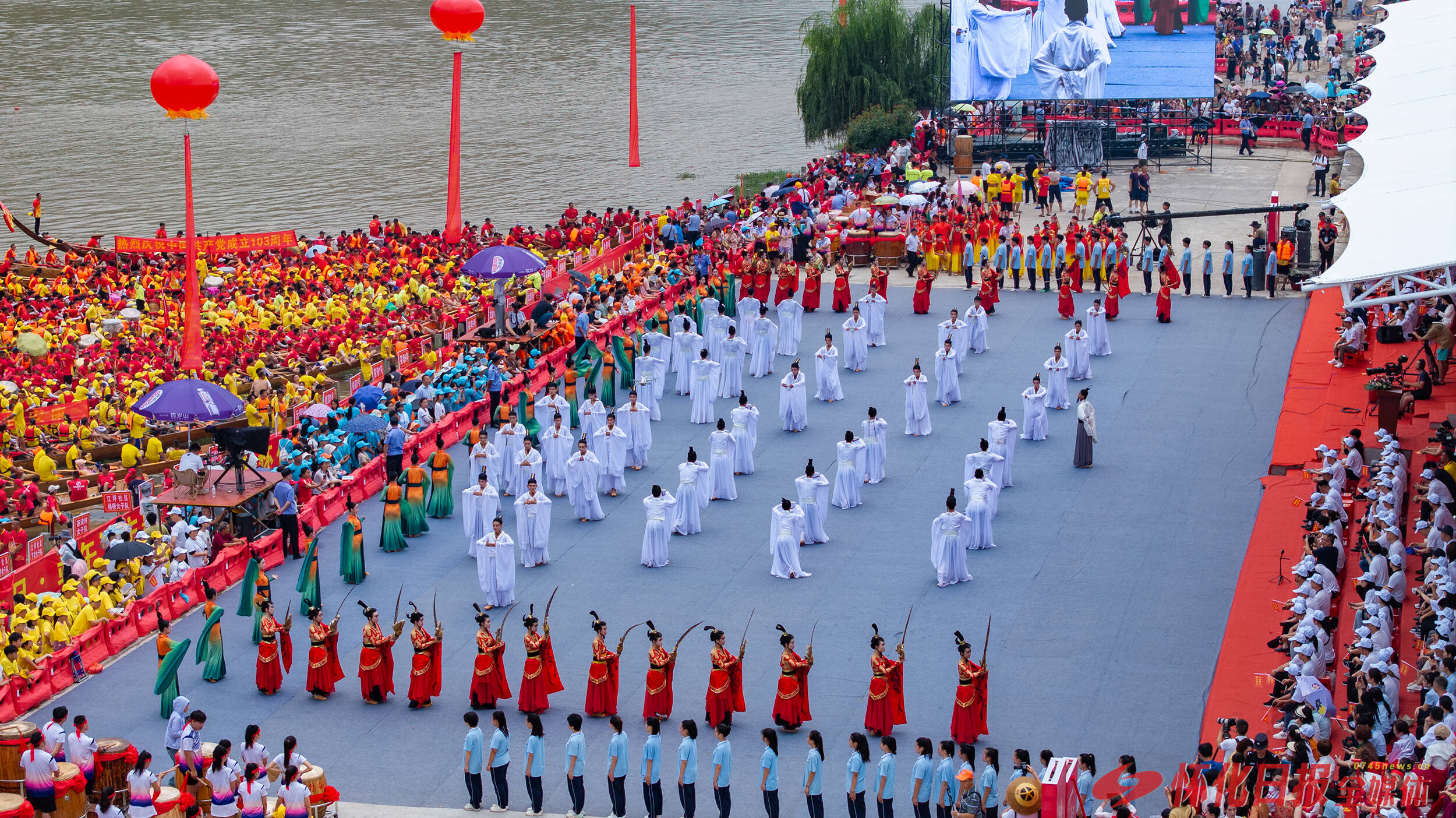 “驾龙辀兮乘雷,载云旗兮委蛇。驾飞龙兮北征,横大江兮扬灵。”2300多年前,在大江口犁头嘴,屈原曾在这里观龙舟竞渡,并在这里写下豪放诗句。2024年6月22日,这样壮观的场景再次在这里隆重上演。