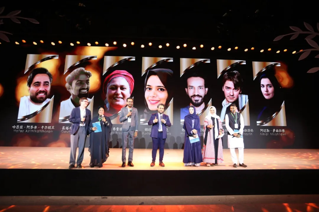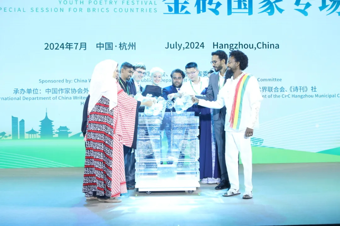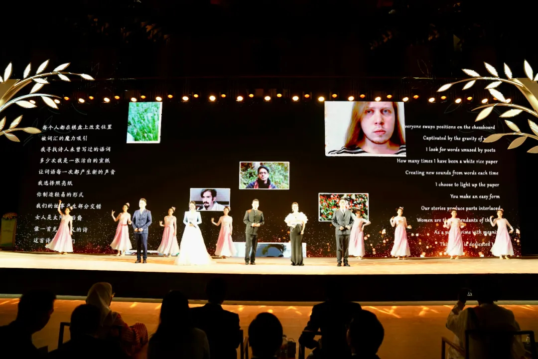 活动现场,路易莎·罗芒及塞费·泰曼(埃塞俄比亚)、维亚切斯拉夫·格拉济林(俄罗斯)、盖蕾娅·弗雷德里克斯(南非)、高塔姆·维格达(印度)、阿迈勒·萨赫拉维(阿联酋)、穆罕默德·穆塔亚姆(埃及)、胡达·穆巴拉克(沙特)、哈菲兹·阿奇米·卡尔胡兰(伊朗)、王二冬(中国)等10位诗人代表将象征取自各国母亲河的“友谊之水”注入舞台中央的玉琮容器,共同浇灌容器中的小树。流动的水流从中央向四周蔓延,舞台两侧的“友谊之树”被点亮,标志诗会正式开幕。枝繁叶茂的树木,寓意着在友谊之水的浇灌下,各国友谊将永远常青。