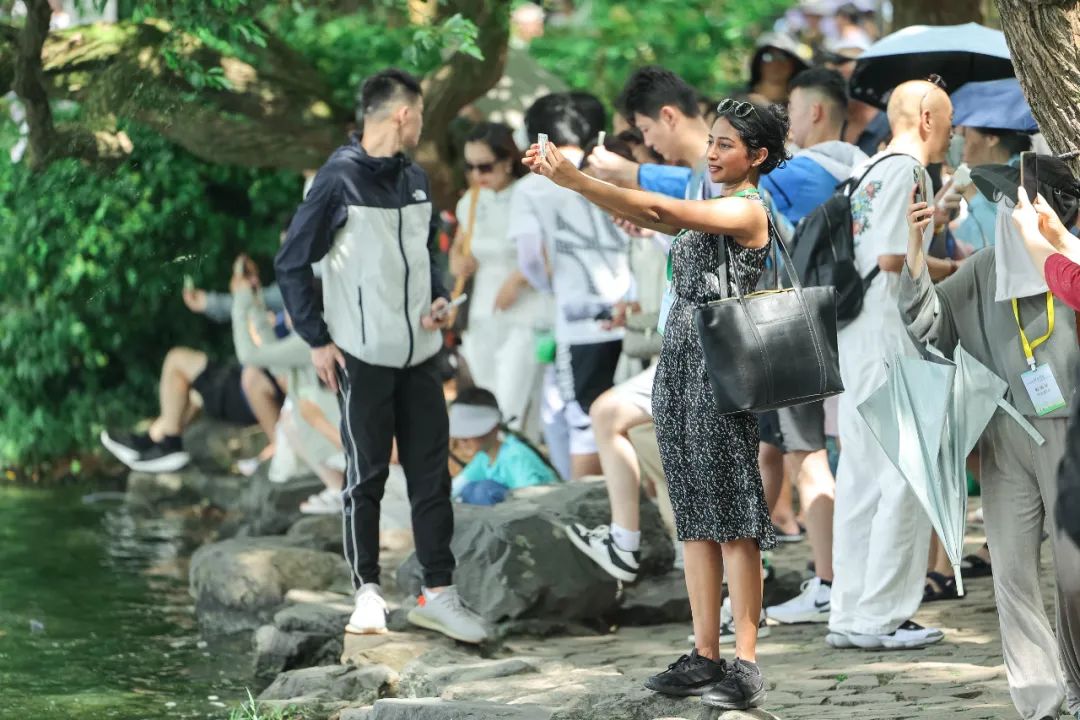 参加“首届国际青春诗会——金砖国家专场”活动的诗人们在西湖边拍照留念