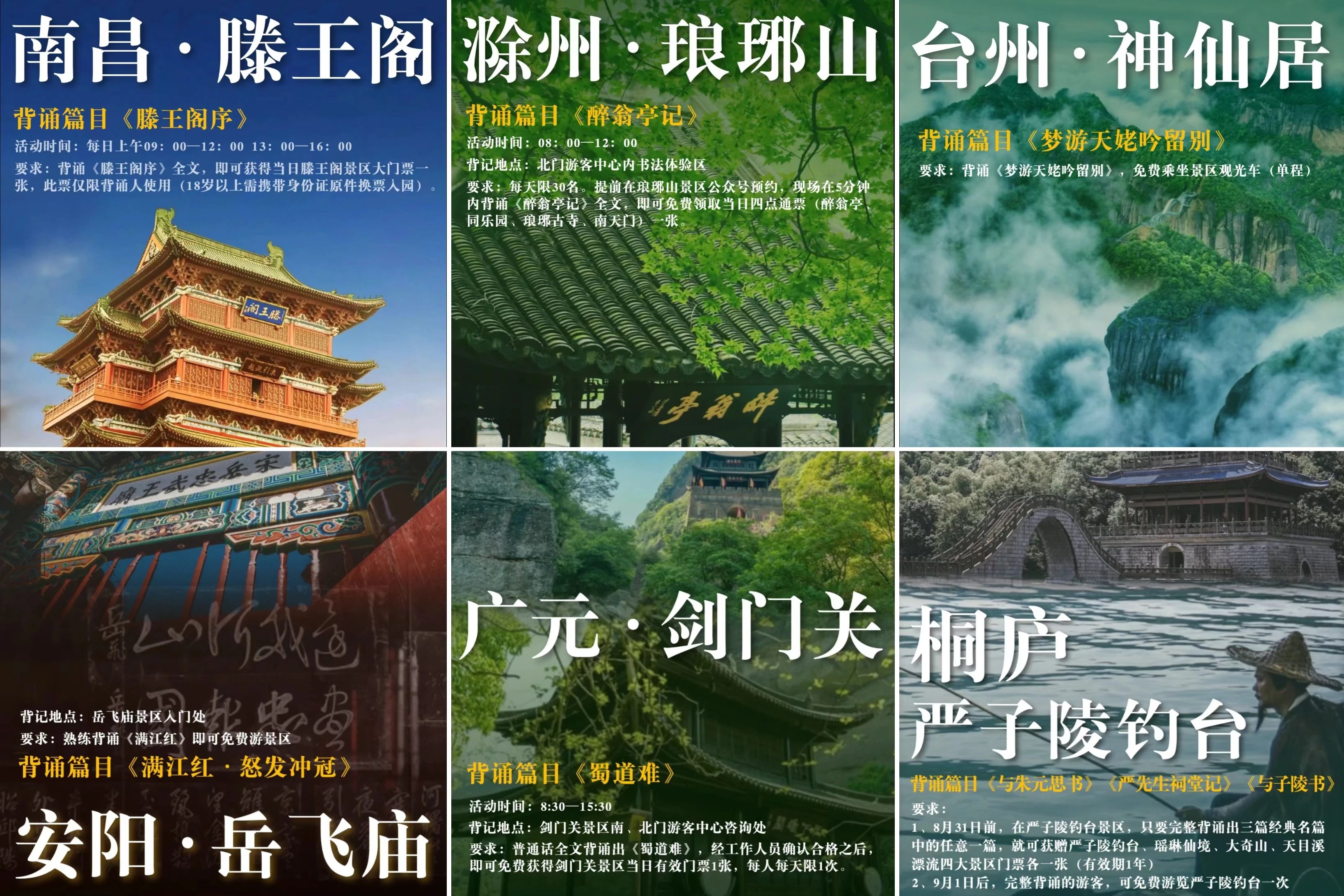 “六一”儿童节当天,在武汉黄鹤楼,5分钟内背诵3首相关诗词的儿童可免票;不久前,绍兴兰亭景区推出活动,游客只需在6分钟内用标准、流利的普通话背诵《兰亭集序》全文,即可免费获得景区门票。今年“五一”期间,四川剑门关、湖南岳阳楼、安徽琅琊山等也推出类似活动。