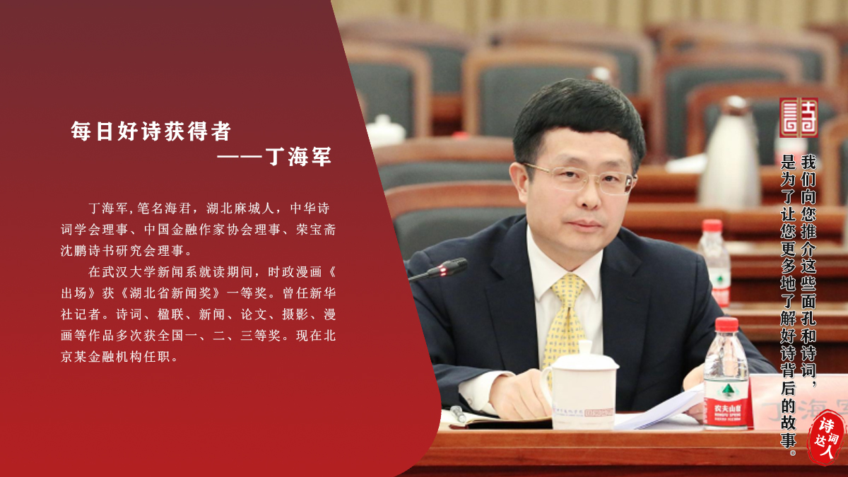 丁海军 笔名海君,湖北麻城人,中华诗词学会理事、中国金融作家协会理事、荣宝斋沈鹏诗书研究会理事。