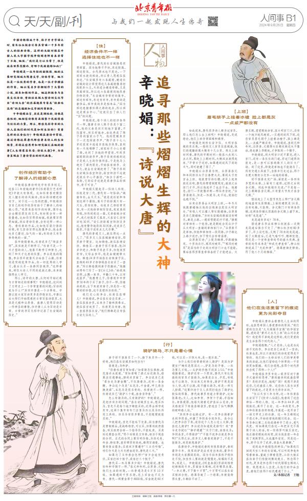 辛晓娟在书里专设一章书写对于唐开元盛世的思考。“唐的盛世到底盛在哪里?是经济发达、地域广阔?我想不单是这些,它还盛在人物。这些诗人在生活里留下的痕迹,才是更为光彩夺目的。”