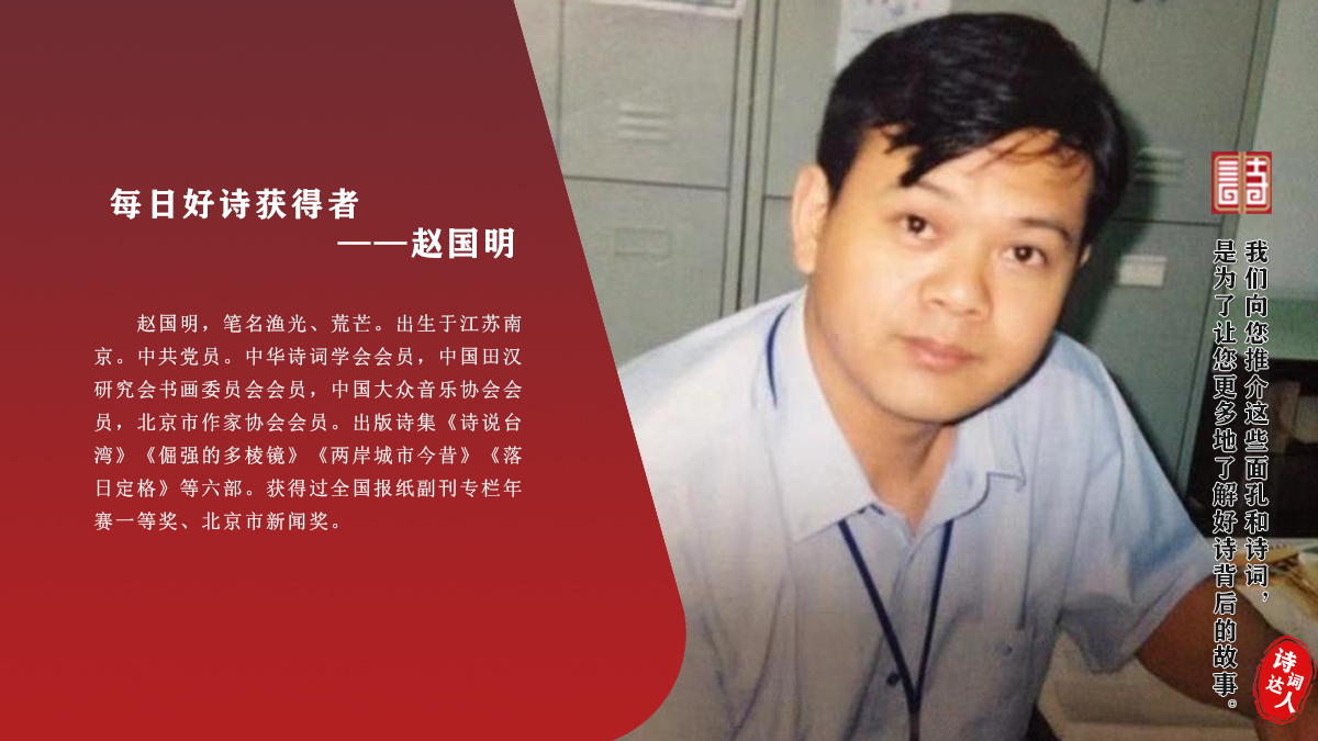 赵国明 笔名渔光、荒芒。出生于江苏南京。中共党员。中华诗词学会会员,中国田汉研究会书画委员会会员,中国大众音乐协会会员,北京市作家协会会员。出版诗集《诗说台湾》《倔强的多棱镜》《两岸城市今昔》《落日定格》等六部。获得过全国报纸副刊专栏年赛一等奖、北京市新闻奖。
