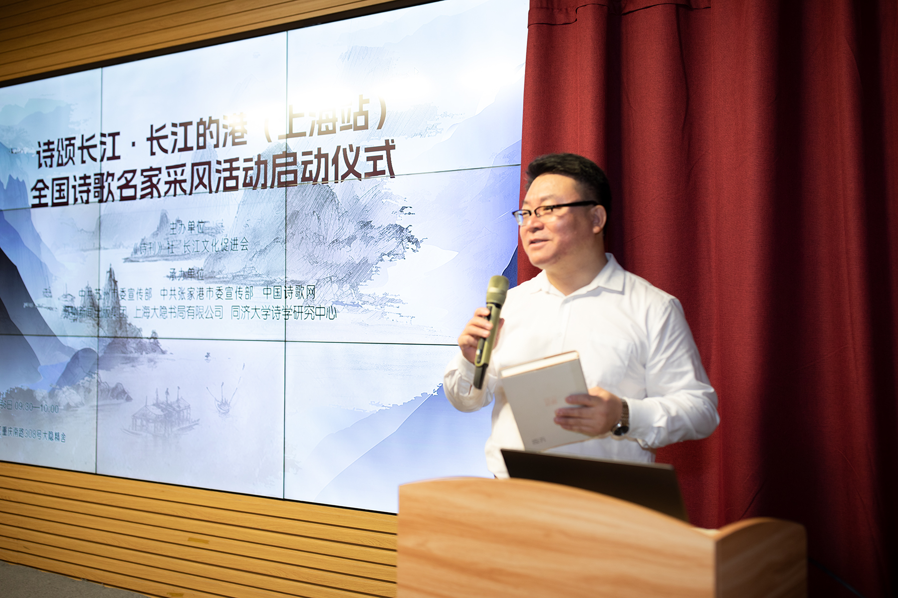 《诗刊》社主编李少君在致辞中表示,长江对中华古典文明和中华现代文明具有特别重要的意义。长江不仅是中华民族的母亲河,也是中国诗歌的母亲河。我们曾经从三江源出发,探寻长江流域的自然之美与人文蕴藏。青藏高原是中国最早的史诗《格萨尔王》创始之地,是诗歌的高地。从青藏高原往下走,长江和中国诗歌的关系太密切了。例如,长江城市奉节,杜甫现存的1000多首诗歌,接近四分之一是在这里写的;宜昌秭归,伟大诗人屈原的故乡;武汉黄鹤楼,这在盛唐就是一个诗歌的擂台、诗歌的比武场,李白、孟浩然等诗人都曾到访作诗。苏东坡从黄州开始成为一个伟大的诗人,写下了《念奴娇•赤壁怀古》《前赤壁赋》《后赤壁赋》等代表作;长江边的庐山,是一座诗山。陶渊明就居住在庐山下。安徽宣城的马鞍山,李白的终老之地;再下来就到了伟大的江南,大量的优秀诗词是璀璨的江南文化的组成部分。南京、苏州、扬州等地,堪称诗词之都。上海在中国古典文明中留下的痕迹并不多,但是,中国的新诗诞生在上海,1917年《新青年》第二卷发表胡适白话诗8首,这个事件被认为是中国新诗的开端。这一期《新青年》是在上海出版的。胡适的《尝试集》也于1920年由上海亚东图书馆出版,这是新诗史上第一部个人诗集。所以,上海可以说是新诗的源头,新诗的诞生是从上海开始,这里也是中国现代文明的发源地。我们这次活动,从上海开始,再到南京、武汉、重庆,要回过头去重新梳理新诗的脉络,看看新诗如何覆盖到中国的内陆,从长江汲取新的诗歌力量,推动新时代诗歌从高原走向高峰,为建设中华民族现代文明做出诗歌的贡献。