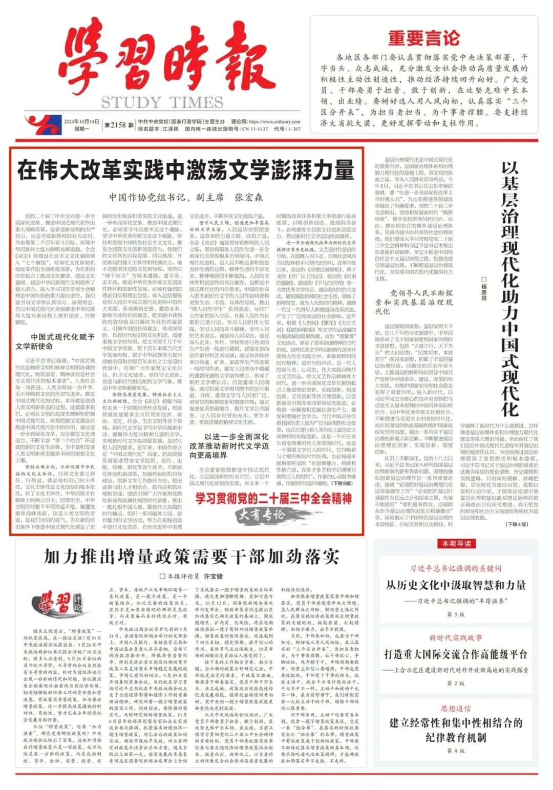 坚持高质量发展,铸造社会主义文化新辉煌。全会《决定》着眼当前和未来一个时期经济社会发展,将高质量发展要求全方位贯穿经济、政治、文化、社会、生态文明等各个领域。新时代文学是书写中华民族新史诗、凝聚伟大复兴精神力量的文学。实现新时代文学高质量发展,是时代和人民的要求。近年来,中国作协立足“中国式现代化”高度,把高质量发展要求贯穿文学组织、创作、出版、传播、研究等各个环节,不断深化体制机制改革,加强作协组织自身建设,创新文学工作路径方法,把出成果与出人才相结合、抓作品和抓环境相贯通,团结引领广大作家热忱描绘新征程波澜壮阔的时代景象,推出一批扎根中国大地、聚焦伟大实践的时代精品,组织一系列服务大局、富有魅力的文学活动,努力在实践创造中进行文化创造、在历史进步中实现文化进步,不断夯实文化强国之基。