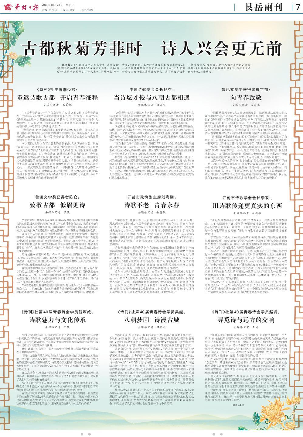 编者按:10月26日上午,“东京梦华 菊香宋韵·《诗刊》社第40届青春诗会”在我市正式启幕。正如《诗刊》社主编李少君所言:“千载宋词,于斯为盛;四十青春,与君同欣。”在开封举办的第40届青春诗会,是一场中国诗歌界与中原文化的交流互动,也是中国新诗与古典诗歌互鉴的盛大雅集。为了让更多读者了解活动情况,近距离了解诗人们所思所想,《开封日报》专副刊部与文旅融媒部共同策划、精心采访推出此专版,以飨读者。