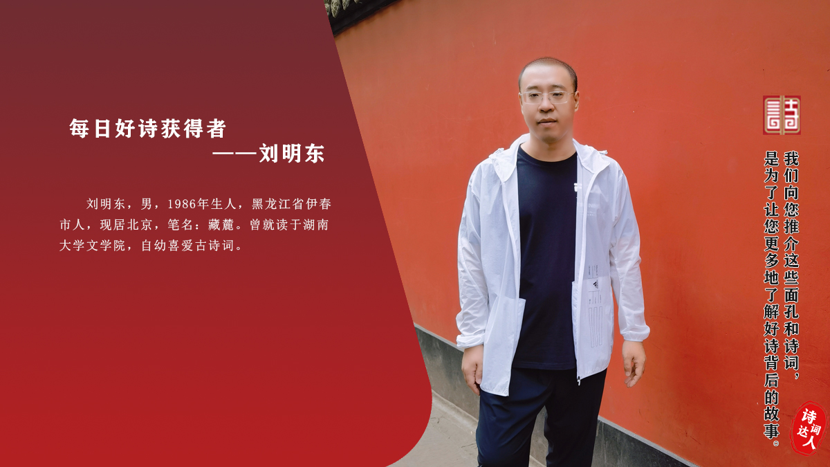 刘明东 男,1986年生人,黑龙江省伊春市人,现居北京,笔名:藏麓。曾就读于湖南大学文学院,自幼喜爱古诗词。工作以来一直从事互联网运营工作。